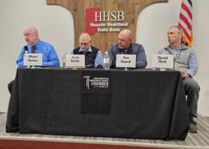 Approximately 40 people ventured to Hoosier Heartland State Bank’s Success Center off U.S. 231 for the Chamber of Commerce’s City-County Legislative Lunch Thursday. Following a lunch catered by Swick’s Kitchen and Emporium, a panel consisting of local representatives addressed a variety of topics ranging from childcare to state legislature. This lunch’s panel included Crawfordsville Mayor Todd Barton; City Councilor Andy Biddle; Montgomery County Commissioner Dan Guard; and Montgomery County Councilor David Hunt.